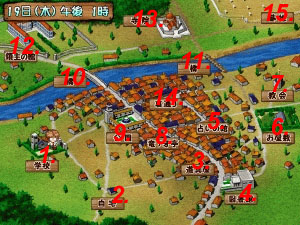 ![]() 1. School (mainly where Iry hangs out) 2. Your House (go there if you want to wait until sunset) 3. Item Shop (go there to buy items) 4. Library (go there to look up info on monsters) 5. Psychic Shop / Hunters Guild (exchange your tokens/view your stats) 6. Mansion (mainly where Mistie hangs out) 7. Church 8. Coffee Shop 9. Park (mainly where Lencia hangs out) 10. Bridge 11. Bridge 12. Mayor's Mansion (mainly where Tira hangs out) 13. Temple 14. Alley 15. Cemetery (mainly where Vianna hangs out) Back to the Main Page |